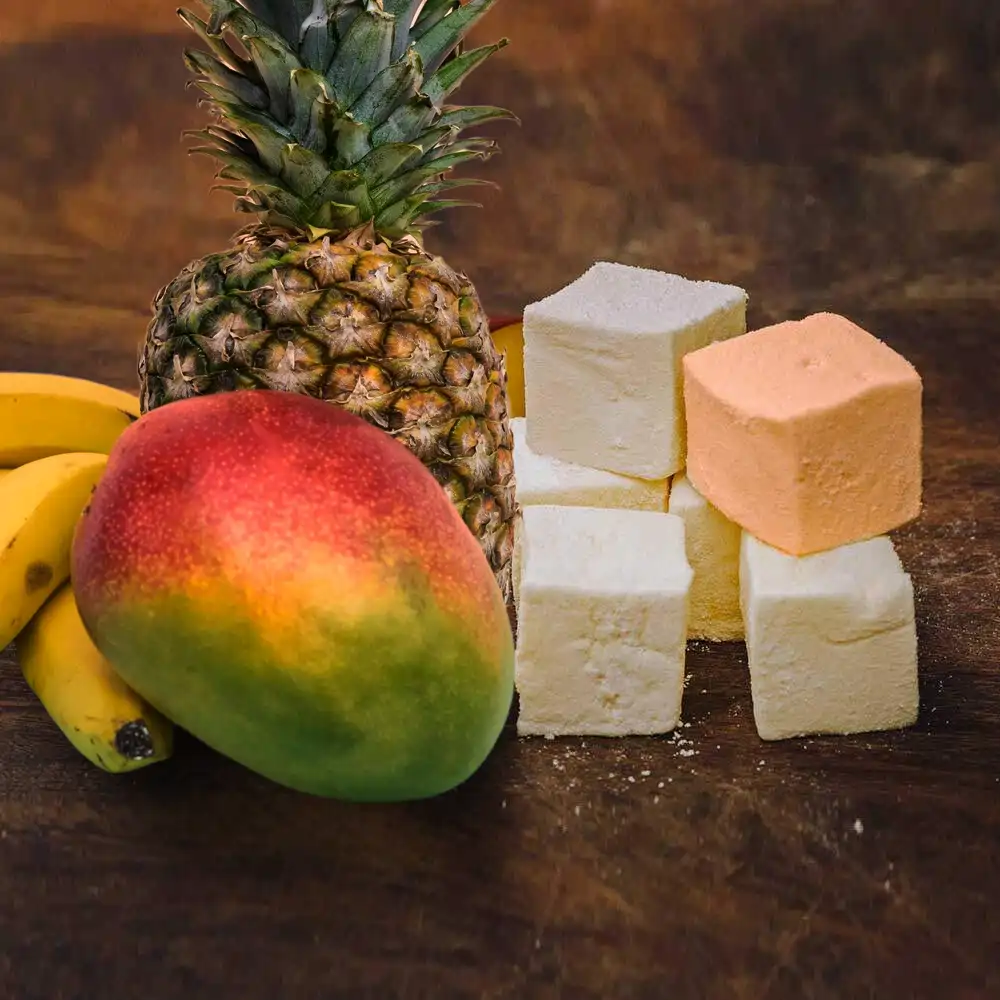 Nuestros marshmellows de fruta fresca son un capitulo aparte. Su textura y dulzor natural te trasladará a las nubes. Te los podemos personalizar con letras de chocolate a lo “scrabble” para comunicar tus mensajes a tus queridos o a tus enemigos dulcemente.
